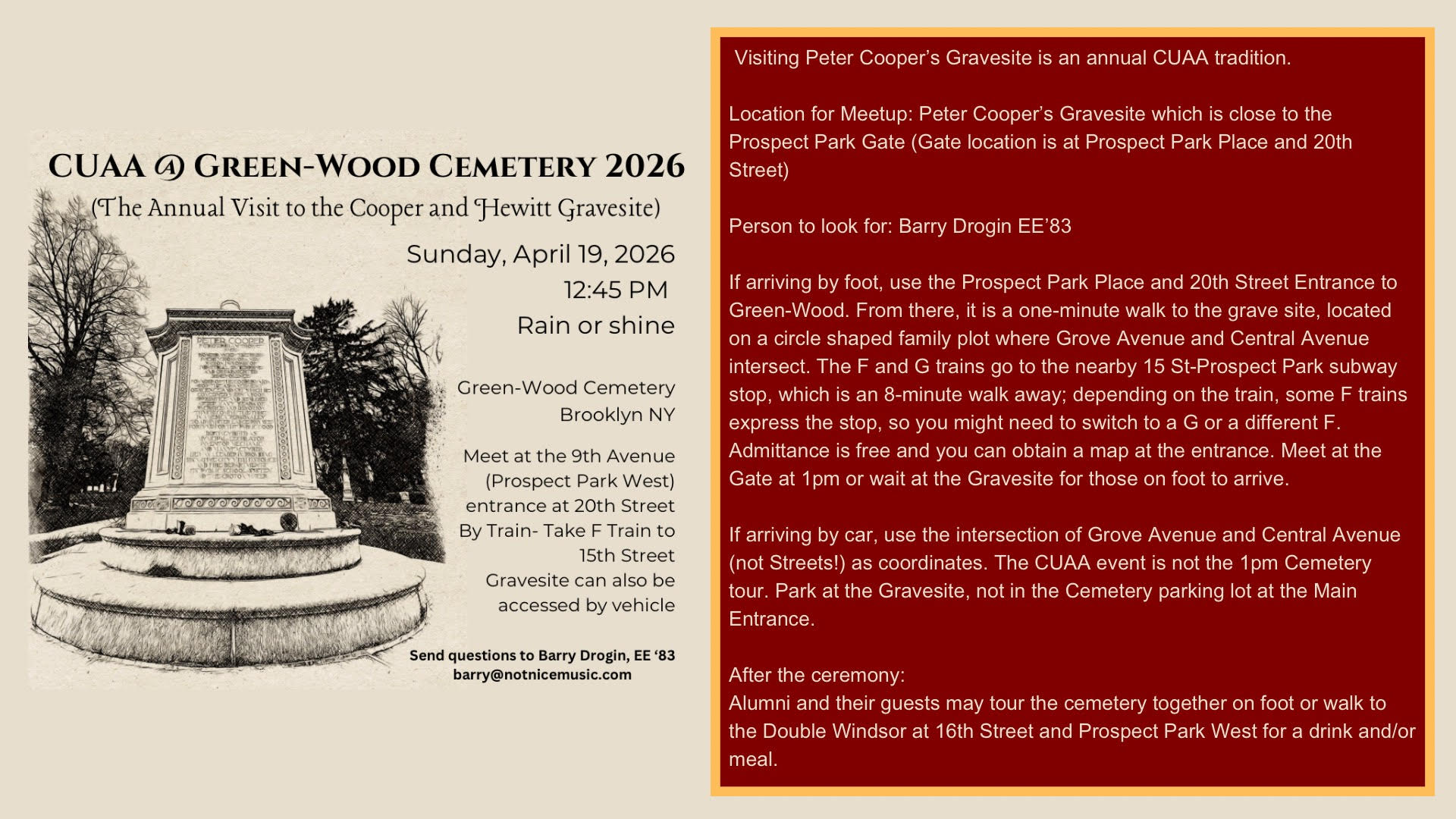 The annual tradition continues. Join CU alumni and students for a tour of the Cooper and Hewitt family grave sites led by Barry Drogin EE’83.
