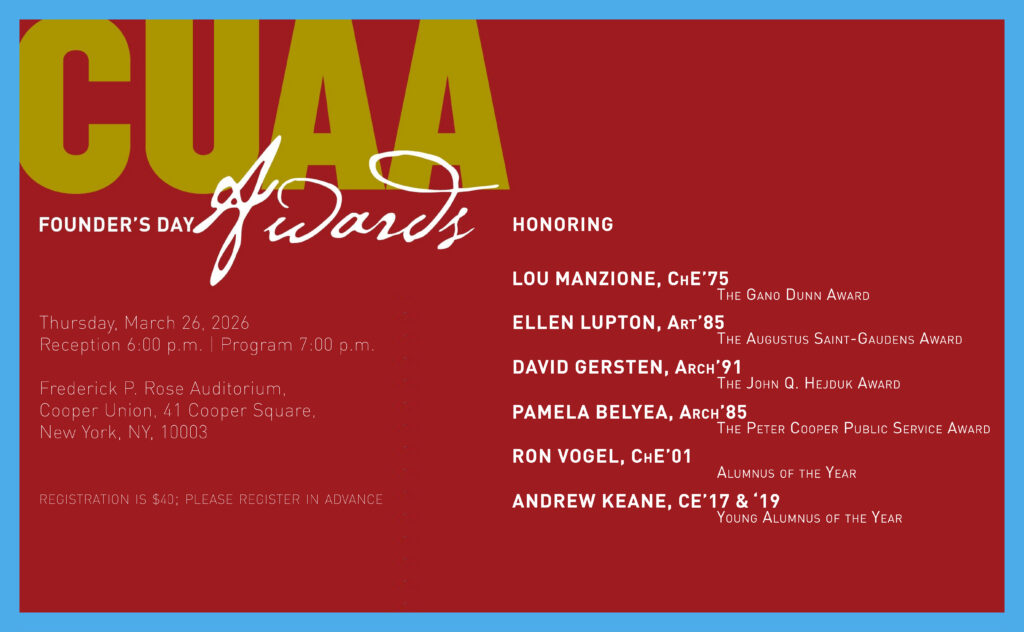 Please join the Cooper Union Alumni Association and The Cooper Union for a joint celebration of the 71st annual Founder’s Day Awards and the Cooper Union Hall of Fame induction on Thursday, March 26, 2026. Reception begins at 6:00 p.m., followed by the program at 7:00 p.m., in the Frederick P. Rose Auditorium, Cooper Union, 41 Cooper Square, New York, NY 10003.